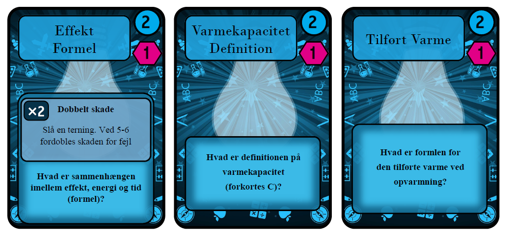 Cards with Danish questions. Translation: “Power formula. Double damage. Roll a dice. At 5 to 6 double the damage for wrong answer. What is the relationship between power, energy and time (formula)?”. “Capacity of heat definition. What is the definition of capacity of heat (symbol C)?”. “Added heat. What is the formula for the added heat during heating?”