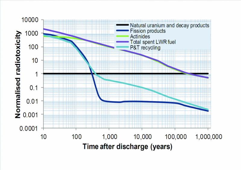 Et diagram der viser aktiviteten over tid (omregnet til biologisk farlighed) af forskellige komponenter i brugt reaktorbrændsel