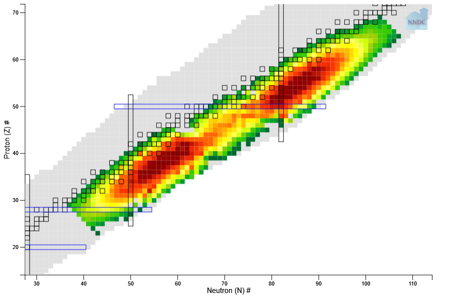 Et diagram der viser fordelingen af fissionsprodukter på isotoper efter spaltning af 235U